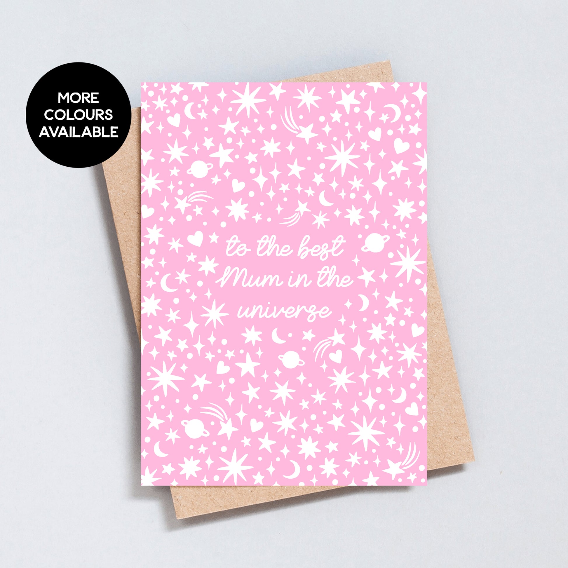 Celebrate the most important woman in your life with this cheerful Best Mum in the Universe greeting card. Covered in playful celestial illustrations of stars, moons and hearts, it’s a joyful way to mark Mother’s Day, a birthday, a heartfelt thank you, or a simple reminder of how loved she is.